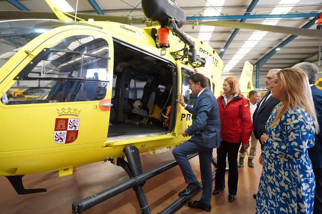 El consejero de Medio Ambiente, Vivienda y Ordenación del Territorio, Juan Carlos Suárez-Quiñones, ha visitado hoy la base del GRS de la Junta de Castilla y León situada en la localidad vallisoletana de Alcazarén, acompañado de la directora de la Agencia de Protección Civil y Emergencias, Irene Cortés Calvo, para presentar el nuevo helicóptero biturbina modelo H145, con el que se cuenta desde el mes de junio en la Comunidad que mejora sustancialmente las capacidades en las tareas de salvamento y rescate. El GRS cuenta con grúa para sus operaciones así como con enfermero para la inmediata atención sanitaria de la persona recatada.