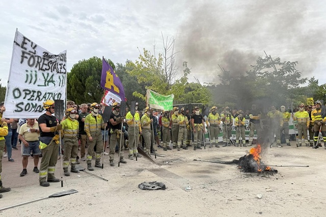 Fuego y humo, aunque en este caso no era una desgracia sino una protesta. Bomberos forestales de toda la Comunidad han organizado una manifestación a las puertas de las Cortes de Castilla y León mientras el presidente de la Junta, Alfonso Fernández Mañueco, comparecía en el Parlamento autonómico para dar cuenta de la situación de los incendios. Una protesta motivada por el "hartazgo" de los agentes y brigadistas durante esta ola de incendios y a la que acusan al consejero de Medio Ambiente, Vivienda y Ordenación del Territorio, Juan Carlos Suárez-Quiñones, y al director general de Patrimonio Natural, José Ángel Arranz, por la "mala gestión". Los bomberos junto a representantes de sindicatos y colectivos han pedido la dimisión tanto del consejero responsable del Servicio autonómico de Extinción de Incendios como del propio presidente Alfonso Fernández Mañueco.