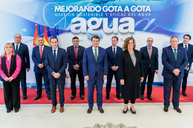 El presidente de la Junta de Castilla y León, Alfonso Fernández Mañueco, y los presidentes y representantes de las nueve diputaciones provinciales han suscrito hoy, en la sede la Presidencia, un protocolo general de actuación para mejorar el abastecimiento y la calidad del agua de 225 núcleos de población de menos de 20.000 habitantes, que beneficiará a 150.000 personas. Este protocolo prevé una inversión conjunta de 90 millones de euros para el período 2024-2027, financiada parcialmente con fondos europeos, e incluye diferentes actuaciones destinadas a modernizar las redes de abastecimiento, renovando 200 kilómetros de tuberías; reducir pérdidas de agua en la red; y digitalizar y mejorar el control del caudal, de la presión y del consumo, con 100.000 contadores nuevos.