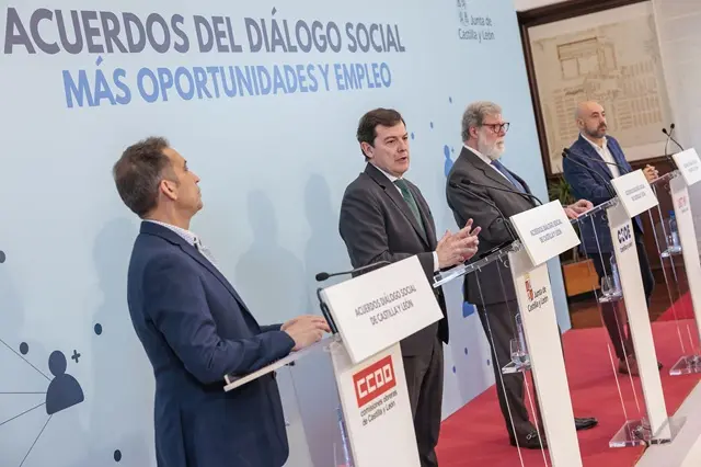 El presidente de la Junta, Alfonso Fernández Mañueco, junto a los representantes de CEOE, CCOO y UGT, ha formalizado hoy cinco acuerdos en materia de empleo, educación e igualdad que movilizarán una inversión superior a los 2.100 millones de euros durante para el periodo 2025-2028. Mañueco ha defendido que el Diálogo Social constituye "una seña de identidad de Castilla y León, una herramienta clave para seguir construyendo una Comunidad que funcione con estabilidad y paz social", y ha reiterado su compromiso firme con este mecanismo, destacando su "eficacia" para mejorar la calidad de vida de las personas. Asimismo, ha señalado que el Diálogo Social se encuentra "en plena forma" y que estos "cinco nuevos acuerdos suponen un paso adelante en la construcción de una sociedad más justa e igualitaria".
