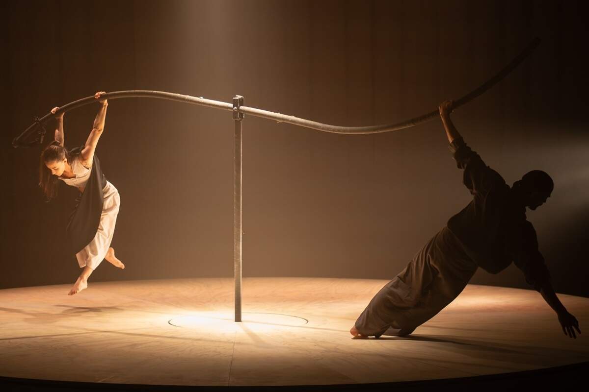 - Descripción: 'En Flora', el escenario está ocupado por una gran plataforma circular en perpetuo movimiento. Giulia Arcangeli y Luis Paredes se persiguen, se unen, se separan y luego se reencuentran, mientras sus cuerpos dibujan coreografías acrobáticas, basadas en el dinamismo y la dificultad, fusionando elementos del nouveau cirque y de la danza contemporánea.