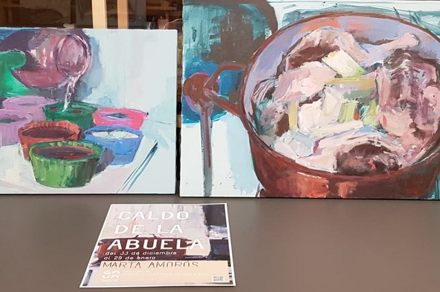 Ollas, cucharas, verduras y carnes salpican estas catorce pinturas que suponen la primera creación personal de la autora, ya que es un proyecto "elegido de principio a fin, concebido de manera integral e involucrándome en cada parte del proceso". En definitiva, ‘Caldo de la abuela’ es una muestra de pintura "cocinada a fuego lento, fruto de un intenso trabajo introspectivo y que nos traslada la experiencia de una década de vivencias".