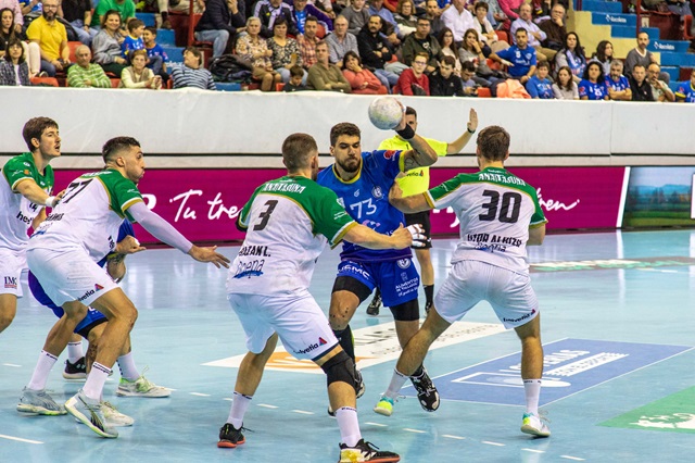 Helvetia Anaitasuna demostró su carácter y poco a poco fue reduciendo la diferencia hasta llegar a ponerse por delante en el marcador con el 15-16 al minuto 28, gracias también al acierto en las acciones de contraataque de Martín Ganuza, que llegaría al descanso con ocho goles en su cuenta y un 100% de efectividad. Así, y después de llevar la delantera durante casi toda la primera mitad, los gladiadores azules alcanzarían el intermedio con 17-19 en el marcador y la necesidad de remontar en la segunda parte. El atasco local se prolongaría en el inicio de la segunda mitad y David Pisonero se vio obligado a pedir tiempo muerto cuando apenas se habían disputado cuatro minutos de juego, al ver que Helvetia Anaitasuna se marchaba en el marcador con cuatro goles de ventaja apoyado en su ataque de 7 contra 6.
