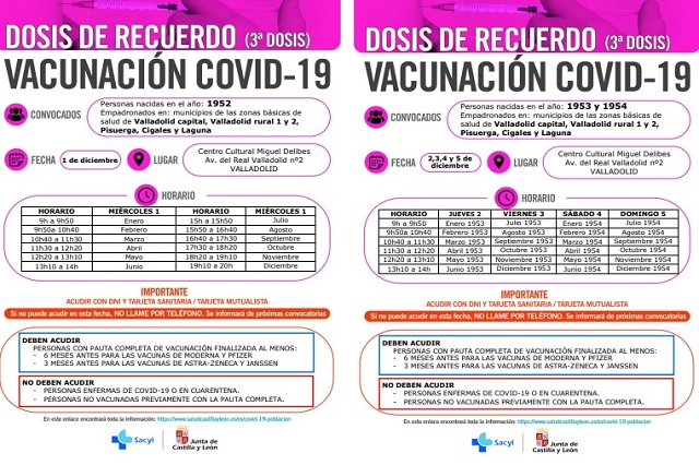 Las siguientes jornadas del 2 al 5 de diciembre está llamada la población de Valladolid nacida en 1953 y 1954, empadronada en municipios de las zonas básicas de salud de Valladolid capital, Valladolid Rural 1 y 2, Pisuerga, Cigales y Laguna. El turno se terminará en cada franja horaria será el turno del mes y el año correspondiente comenzando el día 2 y 3 con el año 1953 y el 4 y 5 está previsto el año 1954.