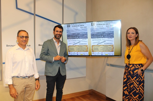Cada mes de agosto, desde hace 25 años, la villa de Tordehumos tiene una "cita imprescindible" con su historia y tradición. El Mercado Artesanal de Tordehumos alcanza su 25 aniversario, una "cifra emblemática" que traerá "la edición más importante de todas" de cara a los días 23 y 24 de agosto. Con motivo de esta celebración, la Diputación de Valladolid, la casa de todos los pueblos de la provincia, ha acogido hoy la presentación del XXV Mercado Artesanal de Tordehumos que ha corrido a cargo del diputado de Innovación Digital, Gobierno Abierto y Contratación y alcalde de Medina de Rioseco, David Esteban, el regidor de Tordehumos, Agapito Bravo, y la concejala ahumada Eva Belén González.