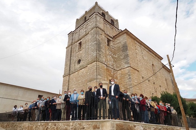 El presidente de la Diputación de Valladolid, Conrado Íscar, el obispo auxiliar de la Archidiócesis, Luis Argüello, y el alcalde de Fombellida, Víctor Alonso Monge, han visitado esta tarde las obras ya finalizadas de ampliación del atrio de la iglesia parroquial de San Antolín.