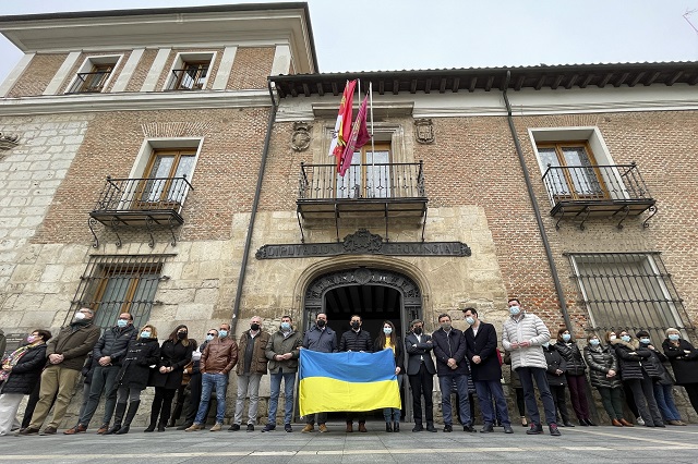 Autoridades provinciales de la Diputación de Valladolid ha protagonizado este miércoles una concentración silenciosa en apoyo al pueblo ucraniano ante el conflicto bélico con Rusia. El presidente de la institución provincial Conrado Íscar remarca la puesta en marcha de ayudas y mecanismos coordinados por el Ministerio y la Junta de Castilla y León en solidaridad con Ucrania.