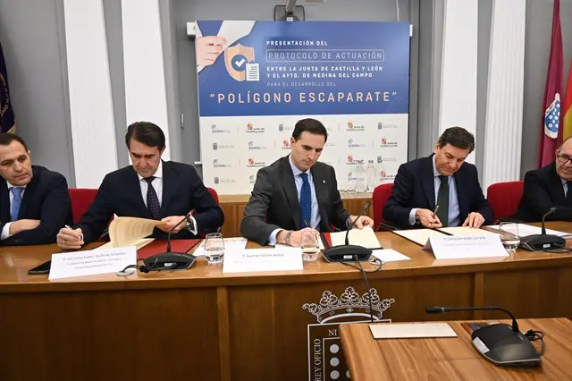 La Junta de Castilla y León y el Ayuntamiento de Medina del Campo han formalizado hoy un Protocolo de Colaboración para la consolidación, mejora y expansión del denominado Polígono Escaparate, ubicado en la carretera CL-612. Este protocolo se enmarca en el Programa Territorial de Fomento para Medina del Campo y su entorno 2021-2024, con el propósito de impulsar el desarrollo industrial, fomentar la actividad económica, generar empleo y crear un entorno sostenible en la zona. La finalidad de la firma del protocolo es consolidar el Polígono Escaparate como un polo productivo estratégico mediante su ampliación, ofreciendo suelo cualificado para atraer nuevas empresas e impulsar la reactivación industrial en la zona, mediante actuaciones sobre infraestructuras de servicios, y mejora y reurbanización del actual enclave.