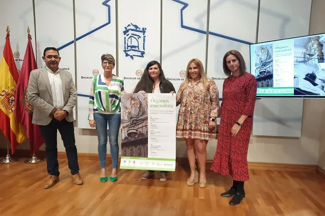 Los municipios de La Seca, Nava del Rey y Rueda organizan 'Órganos con solera', el primer ciclo de conciertos de órganos litúrgicos a cuatro manos de la comarca, donde la música barroca se fusionará con actividades enoturísticas paralelas con visitas a bodegas, fábrica de toneles, talleres o degustaciones. El diputado de Personal, Luis Miguel Muñumer, junto a la alcaldesa de Nava del Rey, Blanca Martín, la alcaldesa de La Seca, Clara Eufemia Rivera, la alcaldesa de Rueda, Dolores Mayo, han presentado en la Sala de Recepciones del Palacio Pimentel el I Ciclo de Conciertos de Órgano Barroco a 4 manos.