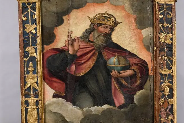 La tabla está flanqueada por dos pilastras de estilo renacentista, con grutescos y en ella se representa la figura de Dios Padre entre nubes y con los brazos abiertos, uno para bendecir y otro que sujeta el orbe. Su interés reside en la calidad de su obra, donde se muestra la pervivencia de arcaísmos junto al gusto de la clientela de su tiempo. La mayoría de los retablos y tablas sueltas realizadas por el pintor, pertenecientes en origen a monasterios vallisoletanos desamortizados, hacen que en la actualidad, muchas de estas obras se encuentren en museos y en colecciones privadas.
