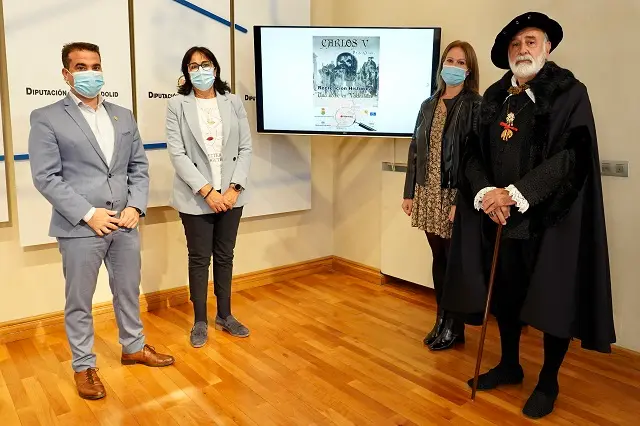 La diputada de Asistencia y Cooperación a Municipios, Myriam Martín, acompañado por el alcalde, Alberto Sanz, la concejal de culturas, Estibaliz Arteaga, el actor, Juan José Garcia Galindo y el técnico de cultura, Juan Carlos Rebollo, presentan en la Sala de Recepciones del Palacio Pimentel, la recreación histórica la llegada de Carlos V a Valdestillas.