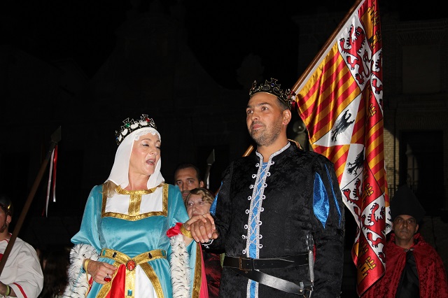 La Plaza Mayor de la Hispanidad de Medina del Campo concentró ya caída la noche a miles de vecinos y visitantes ataviados con trajes de época para recibir a la Comitiva municipal del Ayuntamiento de Medina del Campo y su Aposentador Mayor de la Feria Renacentista, que este año recae en el historiador vallisoletano Carlos Belloso. En el escenario, junto a los pies de la Colegiata de San Antolín de Medina del Campo, en un marco incomparable, tuvo lugar el saluda del alcalde y el discurso de nombramiento del Aposentador Mayor, que hizo regresar a tiempos pasados en los que Medina era la capital comercial y financiera de Castilla.