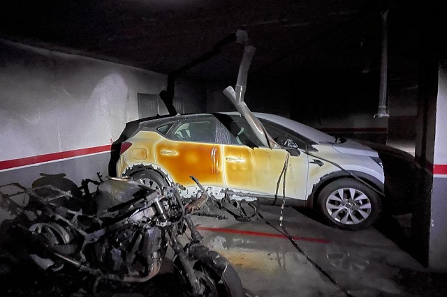 Arden un turismo y una moto en el interior de un garaje en Arroyo de la Encomienda