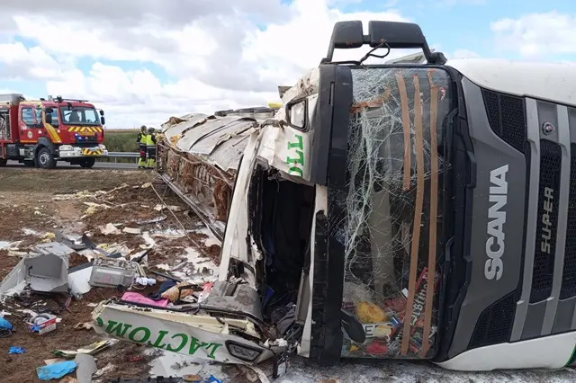 Atrapado un hombre en la cabina de un camión cisterna tras volcar en la A-62 en la provincia de Valladolid