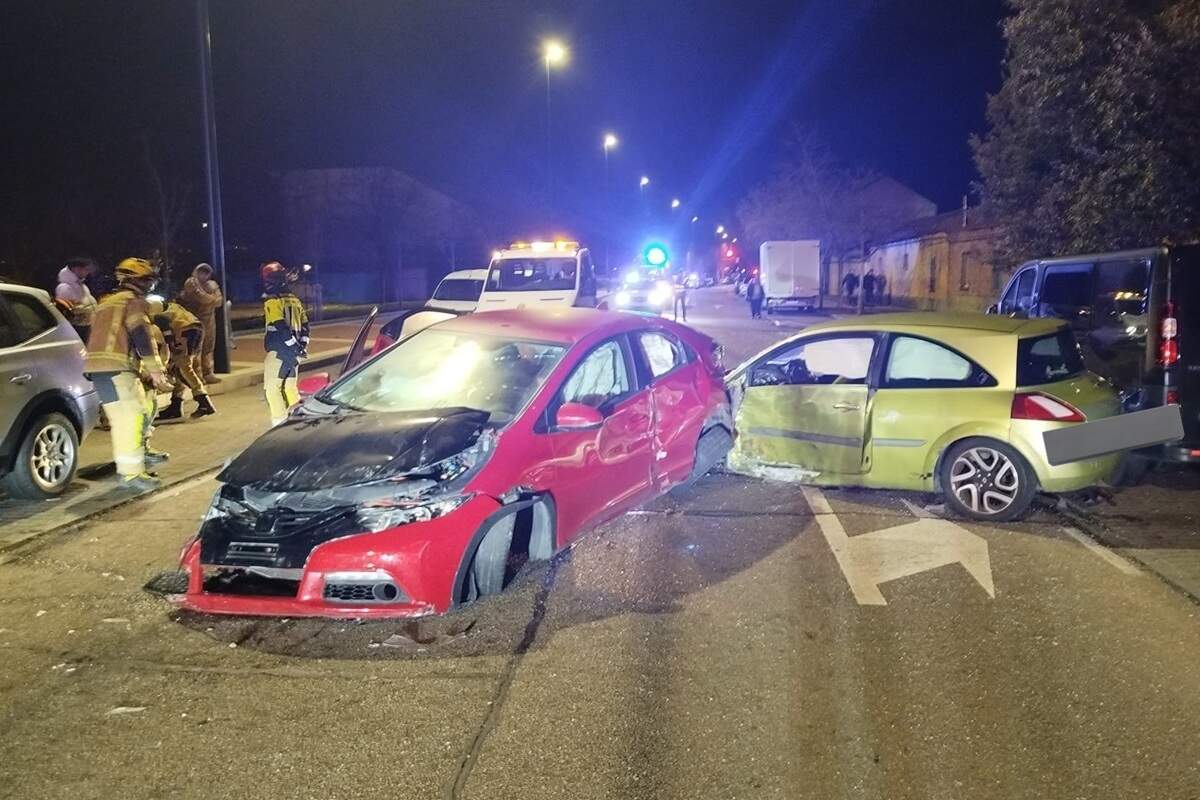 El segundo accidente de esta noche se produjo a las 22.00 horas, por una colisión entre dos turismos que se produjo en el cruce entre las calles Valle de Arán y Baztán. Este siniestro en Barrio España se saldó con varias personas heridas e importantes daños materiales. El 1-1-2 de Castila y León recibió el aviso de este accidente por el que solicitaban asistencia sanitaria para tres personas. Hasta el lugar se desplazaron agentes de la Policía Municipal, los Bomberos del Ayuntamiento y el Servicio de Emergencias Sanitarias de Sacyl que movilizó una UVI móvil y una ambulancia de soporte vital básico.