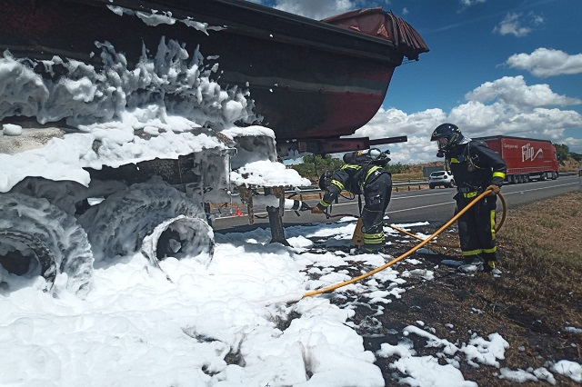 Los Bomberos de la Diputación de Valladolid se han desplazado hasta la A-62 entre las localidades de Arroyo de la Encomienda y Simancas por el incendio en un camión. El fuego provocó una gran columna de humo y ruidosas explosiones en las inmediaciones de Arroyo alertando a vecinos y conductores de la zona.
