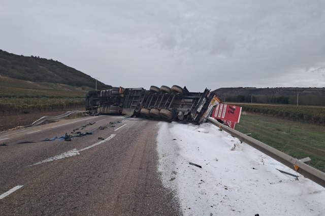 La Guardia Civil de Tráfico ha cortado en la mañana de este jueves 19 de octubre la N-122 entre las localidades de Castrillo de Duero y Nava de Roa por un espectacular vuelco de un camión que ha ocupado toda la calzada. El conductor del tráiler que transportaba material de plástico, por razones que se desconocen, ha perdido el control del vehículo y ha volcado de una manera muy aparatosa entre las provincias de Valladolid y Burgos.