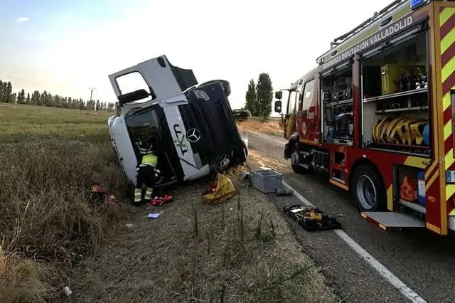 Desde el 112 de Castilla y León se informó a la Guardia Civil de Tráfico, a los Bomberos de la Diputación de Valladolid y al Servicio de Emergencias Sanitarias de Sacyl, que movilizó una ambulancia de soporte vital básico y un equipo médico de Villalón de Campos. Finalmente, los bomberos procedieron a excarcelar al conductor del camión, y minutos más tarde, el personal de Sacyl trasladó en ambulancia al varón de 40 años al Hospital Universitario Río Hortega de Valladolid. Por otro lado, una hora después, a las 08.34 horas de este jueves, se producía otro accidente de tráfico en la provincia de Valladolid. En este caso, resultó ser una colisión entre dos turismos en el kilómetro 1 de la VA-200, en el acceso desde la A-601 a El Soto, en Aldeamayor de San Martín. El 112 de Castilla y León recibió un aviso para solicitar asistencia sanitaria para dos personas heridas, una de ellas atrapada en uno de los vehículos implicados en el choque. Hasta el lugar se desplazaron agentes de la Guardia Civil, los Bomberos de la Diputación y el Servicio de Emergencias Sanitarias de Sacyl. Al llegar, la Guardia Civil de Tráfico confirmó que todos los ocupantes de los vehículos del accidente habían podido salir por sus propios medios y resultaron heridos leves.