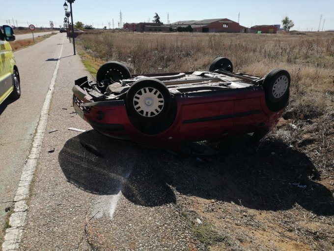 Herida una mujer de 47 años tras volcar con su turismo y quedar atrapada en el interior del vehículo en Medina del Campo. Los alertantes indican que la mujer estaba consciente, pero no podía salir por sus propios medios del coche.