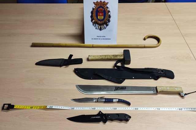 La Policía Local de Arroyo de la Encomienda investiga por un delito leve de hurto a una mujer presuntamente vinculada con una banda especializada en la comisión de sustracciones de productos de alimentación en supermercados de Valladolid. Además, en esta misma intervención, se denunció a otro supuesto integrante de la organización por portar armas en la vía pública, ya que llevaba en el coche un bastón con punta de metal, una navaja de 14 centímetros y dos machetes de grandes dimensiones. Los hechos sucedieron a las 20.14 horas del pasado martes, 21 de noviembre, cuando el 112 comisionó a los agentes de Arroyo en un supermercado sito en la calle Sierra de la Demanda, después de que el personal del establecimiento hubiera sorprendido a cinco mujeres hurtando productos.