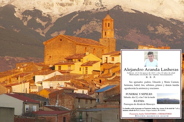 "Las banderas ondearán a media asta, como muestra de respeto y cariño hacia su memoria. Asimismo agradecemos a todos aquellos amigos, vecinos y profesionales, que han contribuido en la búsqueda de Alejandro", han concluido. El cuerpo sin vida de Alejandro, tras ser rescatado por los servicios de emergencias en el río Pisuerga a su paso por Valladolid, ha sido trasladado en las últimas horas a la provincia de Zaragoza, donde su familia le velará en el tanatorio de Tarazona y será enterrado en Alcalá de Moncayo. En concreto, el funeral tendrá lugar este sábado 12 de abril a las 17.00 horas en la Iglesia de Alcalá de Moncayo, y la familia recibirá el pésame tanto este viernes como en la mañana del sábado en el Tanatorio Andía en Tarazona, como refleja la esquela.