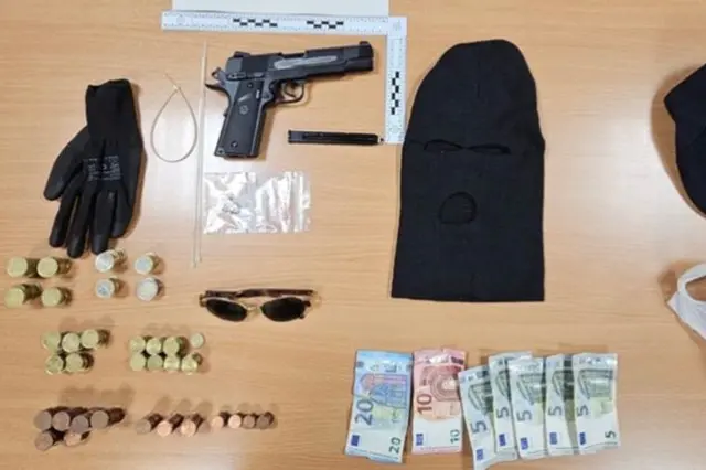 Del mismo modo se le localizaba una bolsa de plástico que contenía un pasamontañas, un guante, una visera negra, unas gafas marrones y 193,02 euros en monedas y billetes. Las manifestaciones de la víctima y los testigos relataban como el varón se había dirigido al establecimiento y pidiendo el dinero al trabajador habría sacado una pistola apuntándole con ella, obligándole a tirarse al suelo donde le habría maniatado con unas bridas, y posteriormente, le introdujo en el baño del local junto a dos clientes.