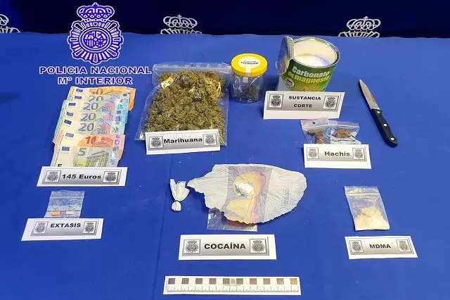 La investigación tuvo que desarrollarse con dispositivos de vigilancia y gran dificultad, debido a las medidas de seguridad adoptadas por el detenido, sobre todo cuando realizaba el transporte de dichas sustancias desde su domicilio hasta el bar. El traslado lo efectuaba en pequeñas cantidades, teniendo que desplazarse varias veces al día, intentando pasar desapercibido. En la mañana del pasado viernes se llevó a cabo un dispositivo policial, procediendo a la detención del investigado y a la realización del correspondiente registro domiciliario donde se intervinieron los siguientes efectos: 10 gramos de cocaína, 11 gramos de MDMA, 50 gramos de marihuana, 11 gramos de hachís, 2 pastillas de éxtasis, sustancia de corte, 140 euros en efectivo y numerosos efectos para la elaboración y venta de las sustancias estupefacientes.