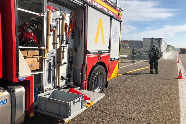 Los Bomberos de la Diputación de Valladolid han sofocado el incendio originado en un camión mientras circulaba por la A-62 sentido Salamanca por la provincia de Valladolid. Las llamas comenzaron en la rueda del remolque del camión, aunque gracias a las rápidas labores de extinción se pudo controlar inmediatamente.