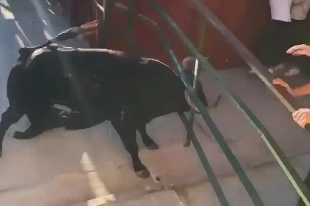 El toro se enfrentó a una de las talanqueras, que contaba con un grupo de personas detrás de la valla, y el astado no dudo en enzarzarse con ella hasta provocar severos daños. Sin embargo, el animal no terminó su tarea, y ni siquiera derribó la talanquera. Afortunadamente, nadie resultó herido, puesto que el astado no se encaró a ninguna de las personas que estaban en las inmediaciones, y a lo largo del recorrido tampoco ocurrió ninguna cogida o percance con los mozos.