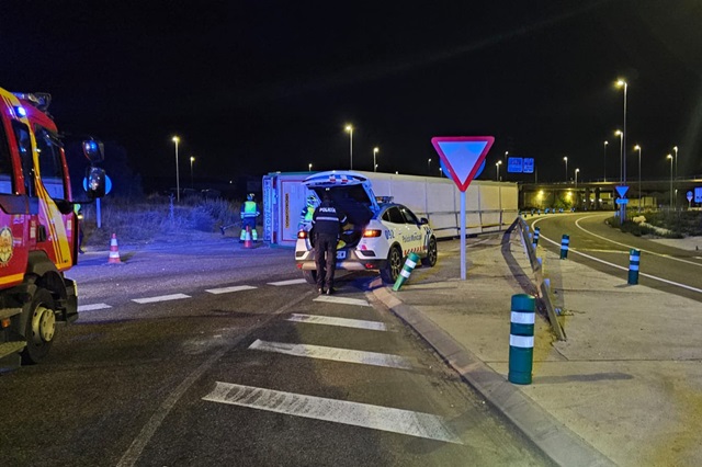 Un camión cargado de cerdos vuelca en la A-11 en La Cistérniga: atrapados dos hombres tras el aparatoso accidente