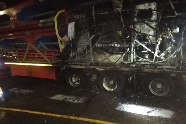 El aviso fue a las 03.13 horas de este viernes 26 de agosto y los Bomberos estuvieron trabajando durante una hora hasta las 04.13 horas con varias maquinas de bomba pesada o nodriza. Tanto el camión como la atracción sufrieron cuantiosos daños materiales.