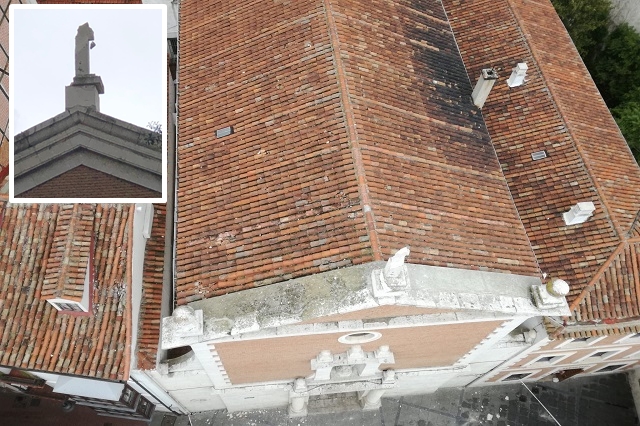 Los Bomberos aseguraron la zona para evitar más caídas de cascotes y retiraron los desperfectos de elementos ornamentales y de las cubiertas de edificios aledaños. Varios viandantes se han quedado asustados por la presencia de los restos de la escultura por las inmediaciones de la Plaza del Salvador, donde mañana se acogerá la salida de la imagen del patrón de Valladolid, San Pedro Regalado.