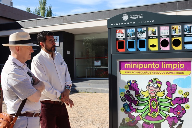Los concejales Alberto Palomino y Alberto Bustos han presentado en Huerta del Rey esta pequeña infraestructura, que se suma a los cinco puntos limpios fijos y los dos móviles que recorren la ciudad. Se incluyen en el contrato que gestiona la empresa Socamex y la Concejalía de Salud Pública y Seguridad Ciudadana en coordinación con el área de Participación han elegido los centros cívicos por se los lugares más frecuentados por los vecinos.
