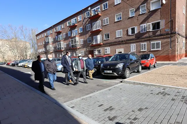 Dicho aparcamiento se concentra en una doble batería central, con circulación perimetral y nuevas aceras pavimentadas con losas de terrazo tipo pétreo de 30 x 30 x 6 centímetros. En los extremos de las baterías se disponen dos pequeñas zonas estanciales en pavimento terrizo con árboles y bancos de madera (estos últimos pendientes de instalar) además de otros cuatro alcorques para árboles de sombra en el eje de la calle. Se deja con pavimento provisional en hormigón la conexión con las aceras de Avda. Reyes Católicos. Previamente se renovó completamente el alcantarillado, dejando también previstas las acometidas para el edificio de viviendas que está rehabilitando la Junta de Castilla y León, y se construyó la nueva red de riego.