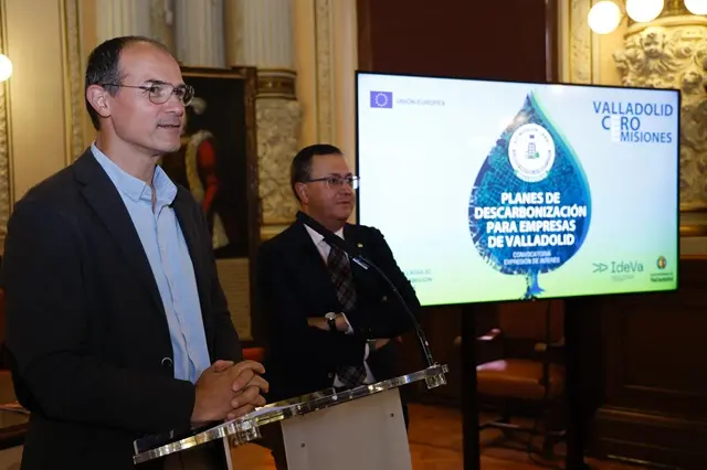 El Ayuntamiento de Valladolid ha lanzado una novedosa convocatoria de planes de descarbonización para empresas de la ciudad dotada con 100.000 euros, financiada a través del proyecto europeo de Interreg Adapt Clima Cencyl, en el que participa con otras ciudades de la red Cencyl. La propuesta ha sido presentada este miércoles 11 de septiembre en la Casa Consistorial por el concejal de Medio Ambiente, Alejandro García Pellitero, y el gerente de la Agencia de Innovación y Desarrollo de Valladolid-IdeVa, Fernando Rubio, y está dirigida a las empresas de la ciudad que estén interesadas en reducir sus emisiones de carbono. Las mismas podrán participar en la convocatoria de expresiones de interés 'Misión Valladolid: Planes de Descarbonización', que lanzará el Ayuntamiento de Valladolid.