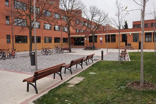 Dentro de este nuevo espacio peatonal, en el que se han mantenido los árboles existentes, se ha construido una nueva zona ajardinada, con césped y arbolado de 130 m2, dedicándose el resto a zona estancial pavimentada, combinando pavimentos de terrazo tipo pétreo de 33 x 33 cm. (en continuidad con el enlosado de los frentes del instituto) con paños de adoquines de hormigón de 20 x 10 x 7 cm. En el frente correspondiente a la prolongación de la acera de la calle Velázquez, se ha utilizado el mismo tipo de losas de hormigón de 40 x 20 x 6 cm. que la conforman.