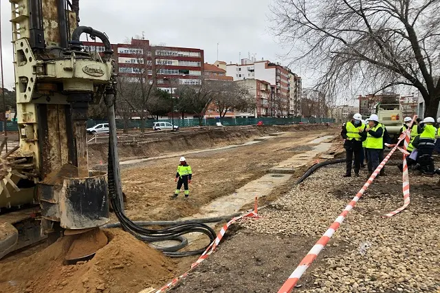 Durante la visita realizada se han podido comprobar los trabajos que actualmente se están ejecutando, como el desvío del colector de saneamiento en la Avenida de Segovia, y la actuación de la pilotadora. También se ha comenzado con los trabajos de las pantallas para la ejecución del primer cajón. El jueves de la semana pasada, 2 de diciembre, se hincó ya el primer pilote (previa preparación de tierras y tala de árboles en la zona) y se ha empezado con el primer cajón de calle Panaderos, en el lado de Delicias, donde la pilotadora se encuentra en funcionamiento. Cuando se acaben las primeras pantallas, se ejecutará el cajón y se empujará debajo de las vías.