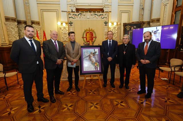 El alcalde de Valladolid, Jesús Julio Carnero, y el presidente de la Junta de Cofradías de Semana Santa de Valladolid, Miguel Vegas, acompañados por el arzobispo de Valladolid, Luis Argüello, han presentado en la tarde de este jueves en el Salón de Recepciones del Ayuntamiento el cartel anunciador de la Semana Santa vallisoletana 2025, en el que una acuarela de Santiago Bellido se erige como protagonista. El autor ha considerado imprescindibles a la hora de llevar a cabo este encargo tres elementos para la adecuada promoción de la Pasión de Valladolid, como son la presencia de la ciudad, el protagonismo de las tallas artísticas y el trabajo de los cofrades.
