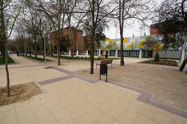 Como criterio general, junto con el mantenimiento de los aproximadamente 60 árboles, se han previsto amplios parterres corridos que los contengan, de modo que, sin dañar las raíces se evite que éstas dañen de nuevo al pavimento. Para ello, ha sido preciso asimismo recortar el fondo del aparcamiento en batería, que estaba sobredimensionado, pero sin necesidad de perder plazas. En la banda paralela a dicho estacionamiento se ha reconstruido la acera correspondiente a la Av. Ramón Pradera con la creación de una zona estancial que enlaza con el centro de la plaza y el enlosado del lateral de la parroquia que se encontraba en tierras, todo ello con pavimento de losas de terrazo tipo pétreo similares a las que se están empleando en otras reurbanizaciones en el Bº Huerta del Rey.