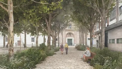 El proyecto plantea mejorar la configuración actual del espacio eliminando elementos superfluos y reforzando la lectura urbana de la plaza a través del protagonismo del arbolado. Para ello se recuperará la antigua alineación perimetral, manteniendo y completando la corona de árboles existente. De este modo, se generará un paseo perimetral a modo de claustro arbolado, que actuará como espacio de transición entre las calles peatonales que desembocan en la plaza y un jardín interior ajardinado.