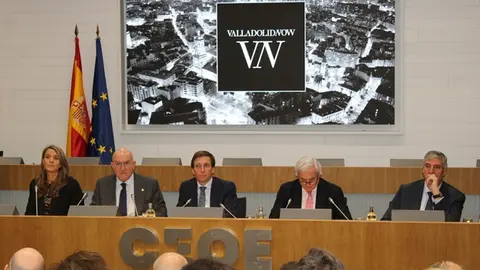 La ciudad de Valladolid ha llevado hasta la capital de España todo su potencial económico para seguir escalando posiciones en la captación de inversiones y talento. Valladolid, lejos de competir con Madrid, se ha convertido en su aliada, en una ciudad donde nuevos inversiones y asentadas firmas puedan instalarse o crecer fuera del entorno madrileño, y el territorio de Valladolid en logística y ubicación es clave en esa búsqueda. La jornada de este miércoles 15 de enero ha sido un paso firme para iniciar la andadura de 'Valladolid Now', la nueva la Oficina Municipal de Proyectos y Atracción de Inversiones de Valladolid, en primer lugar con la alianza de la Madrid Investment Attraction. El acto de presentación ha tenido lugar este miércoles en la sede nacional de la CEOE en Madrid, al que han acudido el alcalde de Valladolid, Jesús Julio Carnero, el regidor de Madrid, José Luis Martínez-Almeida, junto a la presidenta de la CEOE Valladolid, Ángela de Miguel, y el vicepresidente de la CEOE Madrid, Miguel Garrido.