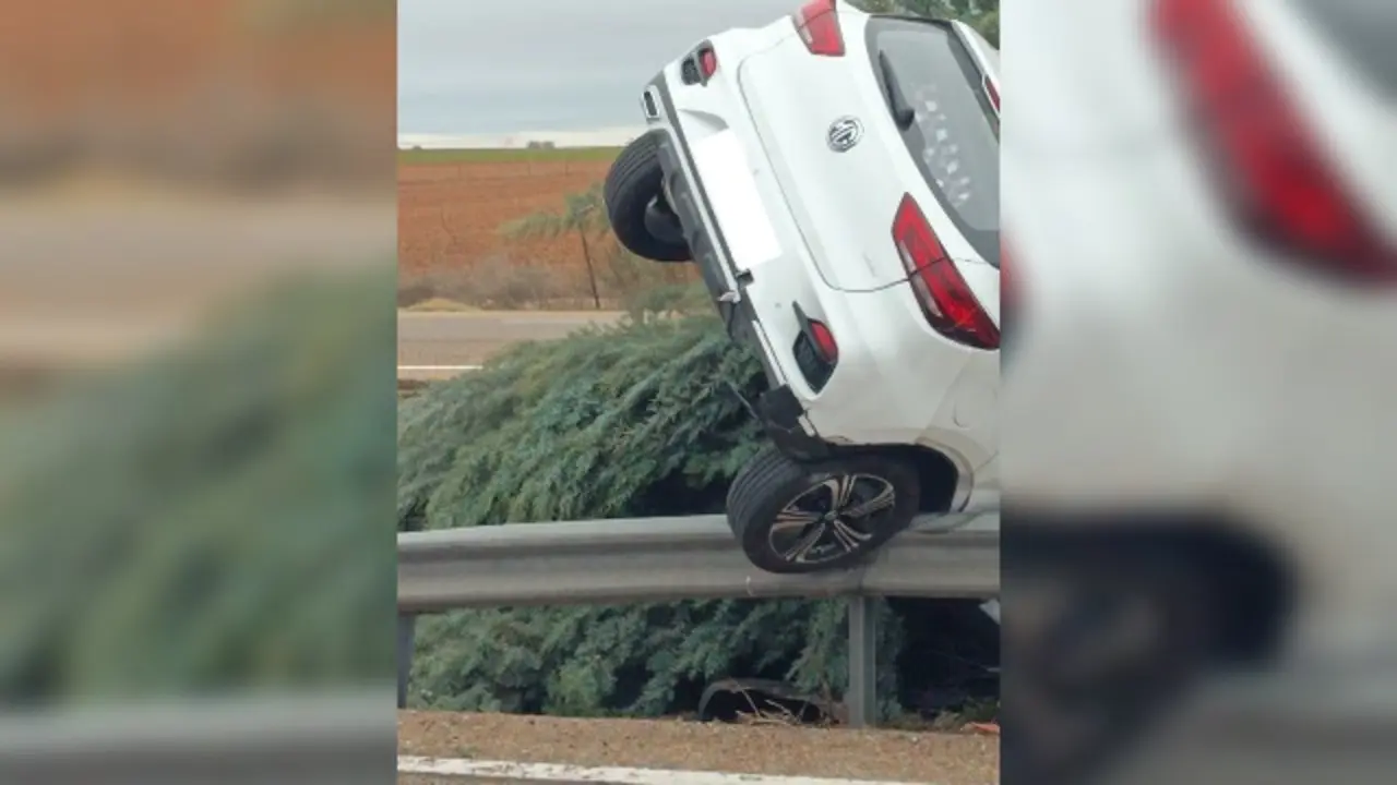 Aparatoso accidente en la A-6 en la provincia de Valladolid que ha acabado con un coche subido al quitamiedos . El siniestro se ha producido a…
